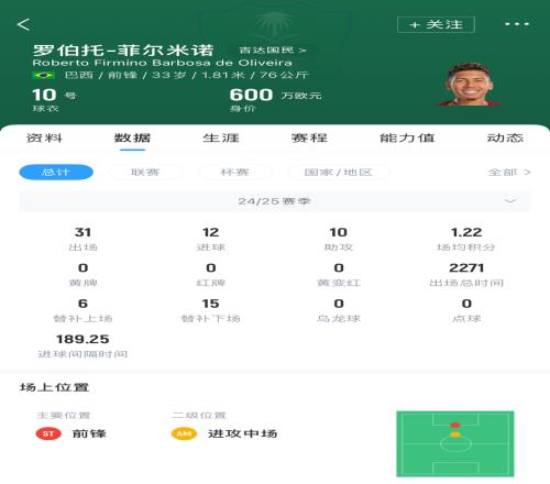在亞冠奪冠之后,吉達(dá)國民本賽季只剩5場聯(lián)賽要踢,而菲爾米諾此前因?yàn)樽韵拗票患_(dá)國民排除出聯(lián)賽名單,也就是說,年薪2000萬歐的菲米本賽季已經(jīng)提前放假,他的賽季數(shù)據(jù)為31場12球10助攻。